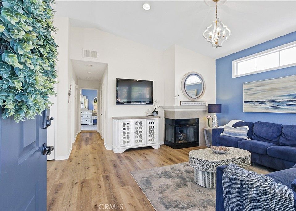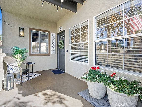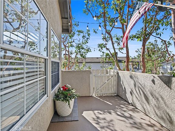 This move-in ready upper-end unit with no unit below features 2 bedrooms and 2 bathrooms, nestled in the Tijeras Creek community at the heart of Rancho Santa Margarita, renowned as one of California's safest cities. Step into the inviting living room with an open floor plan, warm laminate wood floors, vaulted ceilings, and a cozy fireplace. The living room flows seamlessly into the dining room and kitchen, where a beautiful window above the sink enhances the spacious feel alongside ample cabinet space for storage. The spacious master bedroom offers sliding doors to a private balcony, an en-suite bathroom, and new mirror sliding closet doors with a custom closet organizer. The secondary bedroom boasts high vaulted ceilings, new sliding closet doors, and access to a full hall bathroom with a shower/tub combo and plenty of sink space. Additional features include an indoor stackable laundry closet, a one-car detached garage, and an extra parking space. Enjoy outdoor gatherings on the spacious gated front patio, ideal for BBQs and entertaining.