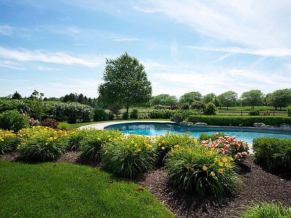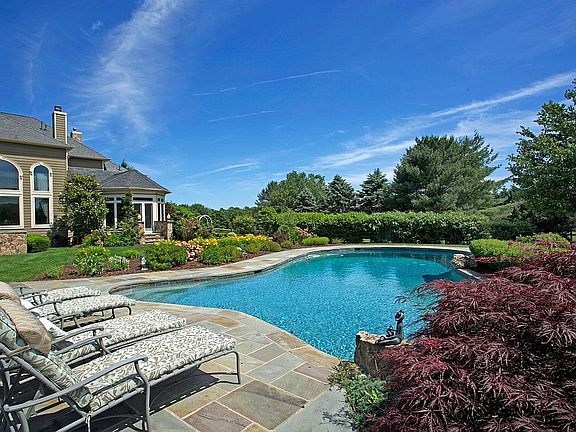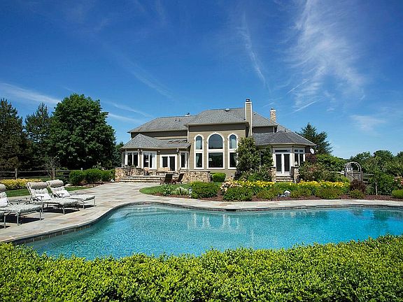 A regal stone and cedar Colonial located on a quiet cul de sac in Tewksbury is surrounded by over three acres of serenity yet convenient to Interstate 78. It presents a beautifully-detailed open floor plan of four bedrooms, four full baths and two powder rooms. Outdoor amenities include a resort-style heated saltwater pool, saltwater hot tub and bluestone terrace stepping down to an enormous bluestone patio. Interior highlights include hardwood floors, classic moldings, four gas fireplaces, custom built-ins, high ceilings and oversized windows. Introduced by a two-story foyer with a butterfly staircase, principal spaces are comprised of formal living and dining rooms, a coffered ceiling family room, and a spectacular center island kitchen featuring furniture-grade cabinetry, granite countertops and upper-end stainless steel appliances. Spacious bedrooms include a first floor master suite providing a bed chamber, sitting room, dressing area, fireplace and two master baths. The finished lower level offers a generous recreation/billiards room, while the exercise room, home office and powder room enhance the layout. Other notable aspects are the passive heating system on this level as well as a built-in generator.
