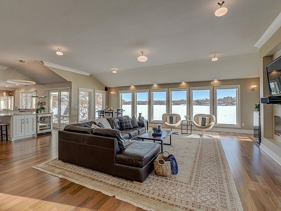 Lakeside bedroomShores of lake gilfillanMid-century modern ramblerThree car garagePanoramic lake viewsMain floor primary suiteAdjacent bar area