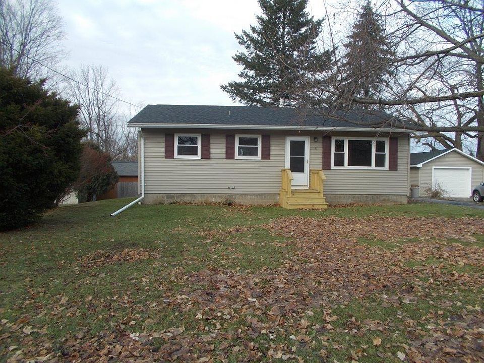 Remodeled Ranch home in village. Perfect starter home or down sizer. New in 2018: roof, both house & garage, kitchen, appliances, all flooring, bath fixture, paint & electric service. 3 bedrooms, 1 bath. Easy lot to maintain, 2 driveways. Easy show, full basement & detached 1.5 car garage