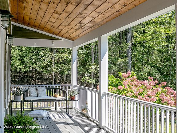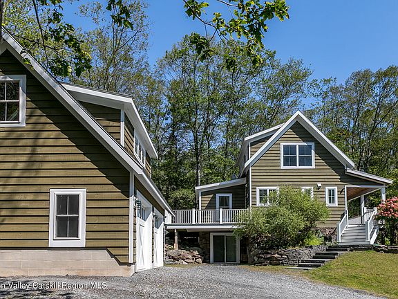 Welcome to Wild Wind - a stylish modern farmhouse situated on a quiet country road at the base of the Catskill Mountains. If you have been looking for a turn-key property in excellent condition featuring both modern and rustic aesthetics, then Wild Wind could be the perfect match. The home is spacious and inviting with an open kitchen, living room and dining room, featuring a large kitchen island and stone fireplace. The dining room sliders open on to a back deck that runs the length of the house for outdoor entertaining. The second floor includes two spacious bedrooms with high ceilings offering incredible natural light and a spa-like bathroom. The fully-furnished lower level includes additional space for guests as well as a home office, den and full bathroom. The manicured yard features bluestone steps and a bluestone patio that leads to the oversized 2 car garage with a finished space upstairs (an ideal spot for a studio, work shop or game room). Additional features include a whole-house water filtration system, Schoolhouse light fixtures, Nest thermostats, and an electric car charger in the garage. This property offers the best of being surrounded in nature while being convenient to Hunter, Woodstock and the Village of Saugerties. Just 2 hours to NYC.