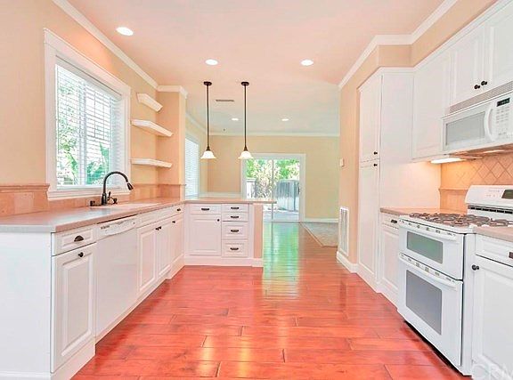 Beautifully upgraded Potters Bend Home privately located on one of the largest lots in the neighborhood and has just one neighbor. Features include new carpet and fresh paint throughout, plus distressed hardwood flooring an updated fixtures throughout. The large remodeled kitchen boasts white cabinetry, Corian Counters w/Seamless Sink & Tumbled Stone Backsplash, crown molding, added storage & French door entry to flagstone patio area. Light and bright family room features professionally installed pre-wiring for a flat screen tv above the gas fireplace. Upstairs master bedroom includes a private master bath suite, walk in closet, and lots of windows which brings in a lot of natural light. Upstairs open loft area also features a large tech center that has a built in desk. This detached condo is unlike others throughout Ladera Ranch. This hidden gem features it's own private 2-car driveway, a spacious yard that features a patio plus a separate deck area and a dog run. Located adjacent to a neighborhood greenbelt, this unique Potters Bend home is also in the Echo Ridge village of Ladera Ranch which is centrally located between the shopping centers, award winning schools and just steps away from the Botannica Trail which is perfect for biking and running.