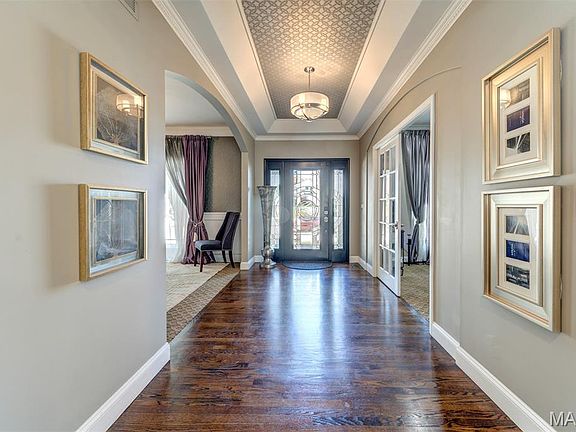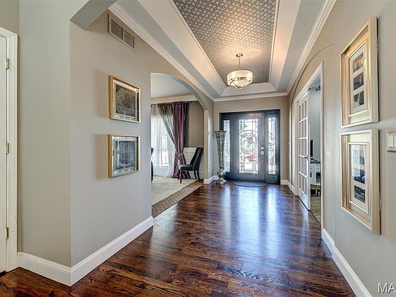 Stunning Upgraded Home in the Heart of St. Charles County. Nestled in a quiet neighborhood, this beautifully updated single-family home blends luxury, comfort, and thoughtful design. The main level showcases wood floors, elegant crown and base molding, two home offices, and a gourmet kitchen with Granite countertops, Monogram stainless steel appliances, dual refrigerators, 6-burner gas cooktop with pot filler, microwave drawer, beverage fridge, and custom cabinetry with pull-outs and lighting.The inviting great room features a stone accent wall and opens to a large deck overlooking a private, fenced backyard with mature trees—perfect for entertaining. Upstairs, enjoy hardwood floors in the hall and loft, updated Jack & Jill baths with granite and tile, spacious bedrooms, and a guest ensuite with double sinks. The luxurious primary suite offers a tray ceiling, sitting area, spa-inspired bath with dual shower heads and soaking tub, and a custom walk-in closet. Additional highlights include a formal dining room, upper-level laundry, mudroom with built-in dog wash, and an optional double-unit fridge. The finished walkout basement features 9-ft ceilings, granite wet bar and kitchenette, full bath, fitness/bonus room, and ample storage. Dual HVAC systems (1 & 2 years old), humidifier, two water heaters, and newer picture windows in front rooms. Rare opportunity—homes with this level of craftsmanship and upgrades seldom come available!