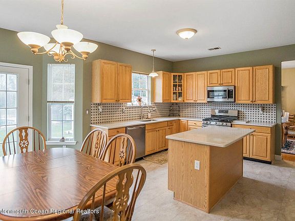 Welcome home, nothing to do but unpack. Located in Howell, this home features 4 bedrooms, 3 full baths plus a bonus room, finished basement with storage room and 2 car garage. Kitchen & foyer boosts luxury vinyl flooring, island with extra oven, dinette and quartz countertops. High ceilings in living room and dining room with chandelier with lift. Large family room with fireplace. Backyard has shed, gazebo, and inground pool with new liner. In ground sprinklers with well. New A/C units and 2 zone heating and A/C. Pool table is included. Don't miss this great opportunity!