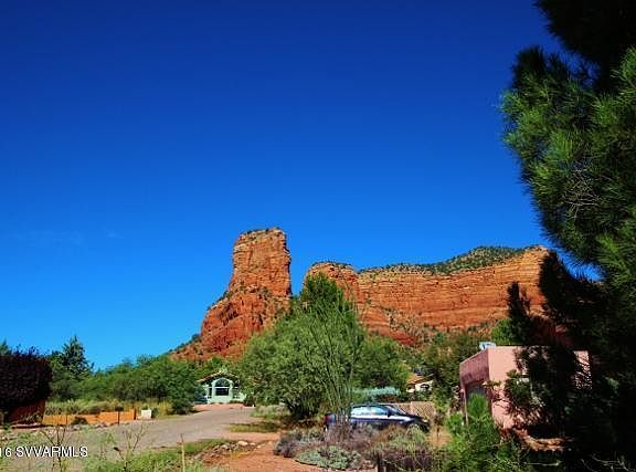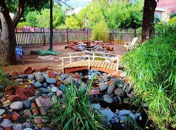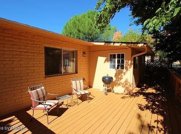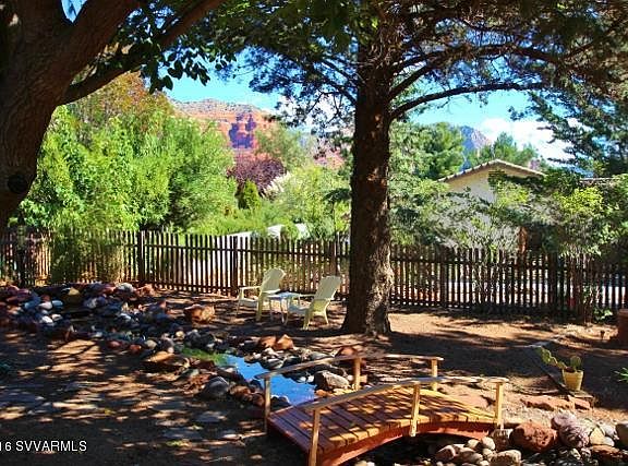 Castle Rock views from flagstone patio & covered patio in front. 'Sedona look' adobe brick with new roof (10/16), move in ready. Oversized 1 car garage with heated & cooled studio/office/den behind & spacious laundry room. Enter covered patio to an open floorplan with updated kitchen counters, large porcelain travertine faux tile, flagstone wood burning fireplace with Great Room, shaded by mature trees & landscaping. Pond on timer in backyard, .34 acre of outdoor living space to include back raised deck for red rock views. Spacious Master Suite with full bath. Guest Bedroom has walk in closet, large windows, 3/4 adjacent bath. Wood blinds throughout. Baths have tumbled stone, faux travertine tile surround, updated fixtures & lighting; brick trimmed portal window adds that unique charm.