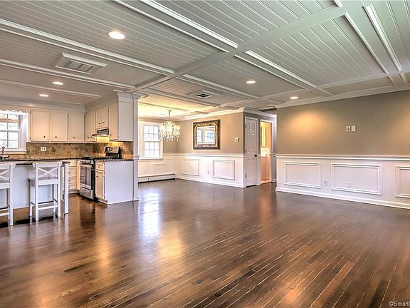Desirable Bright Open Concept 3-BR Ranch with extensive millwork on 1.20 acres in the "Tashua" area is available for immediate occupancy. This updated home includes some very unique finishes with coffered ceilings, crown & wainscoting molding throughout & recently stained HWD flooring. The white kitchen features granite counter tops, tile backsplash & freestanding Island. The Dining Rm w/decorative chandelier is separate from the kitchen yet still open to the living space. Off the Kitchen is the Family Room with woodburning Fireplace, wainscoting and built in surround sound speakers. Adjacent to this is the half Bathroom and convenient main floor laundry. The MBR includes an updated Full Bath w/pedestal sink and walk-in closet. The additional 2 BR's share the remodeled full Bathroom w/wainscoting and tile shower/tub enclosure. Off the back of the house is a fully screened covered porch with views of the wooded rear yard, great for those summer evenings. There is an additional 400SF of living space in the L/L Playroom, 1 room carpeted and a 2nd with laminate floor. Great for office or workout room. Finally there is a deceptively deep 4 car tandem garage. This home is located within walking distance to the award winning Tashua Elementary School and close to Tashua Golf Course and recreation area featuring tennis courts and 1 of the towns 2 public pools. Simply move in condition!