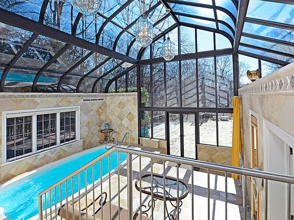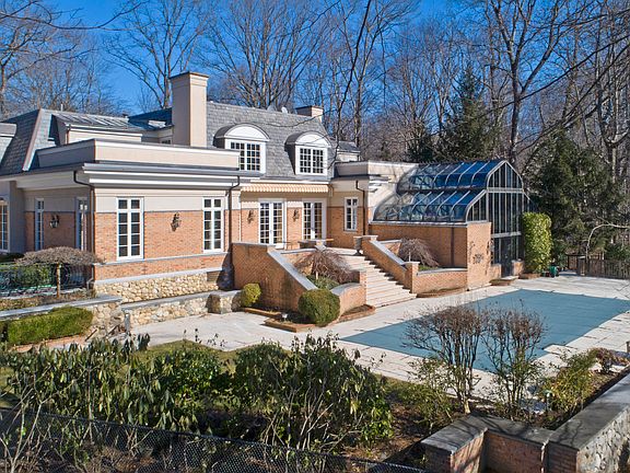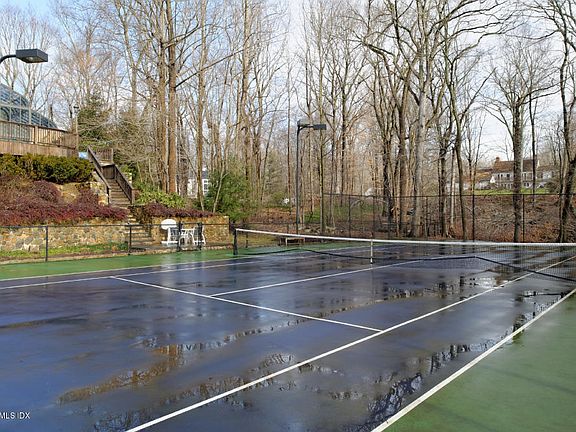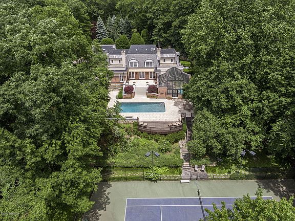 Superb 6 bedroom home set on two beautifully landscaped gated acres showcases a spectacular backyard oasis - Stone terraces, pool, tennis court and indoor spa overlooking a lake, provide an idyllic retreat just minutes from town. Elegant main level boasts four fireplaces; exquisite architectural details; double height entry hall with herringbone wood floors and butterfly staircase: living room with French doors to terrace; den; eat-in chef's kitchen; dining room with cove lighting; library; master suite with walk-in closets, glass atrium with indoor pool, sauna and steam. First floor Master. 4 en-suite bedrooms and separate au-pair suite comprise the second floor. With lower level game room and attached, heated three-car garage.