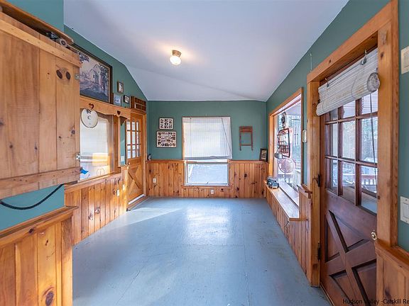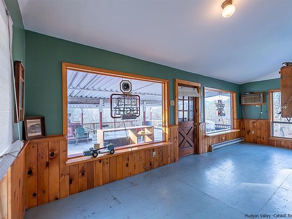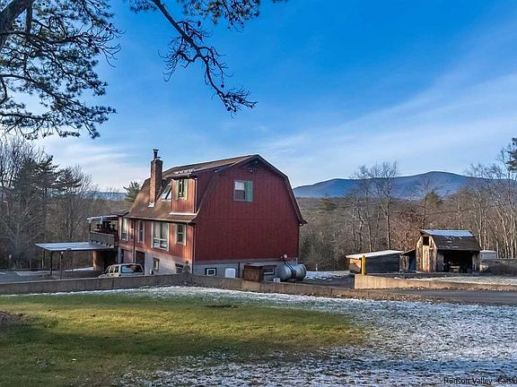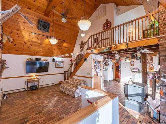 First time on the market, this lovely Cape Cod home offers 3 bedrooms and 2 baths on 2 private acres. The home is positioned in such a way as to take advantage of all-day sunlight. Off the living room is an enclosed porch that in turn, leads to a 715 square foot patio overlooking breathtaking mountain views. One flight up takes you to the open plan, living room, dining room, and kitchen all featuring terracotta flooring. Cathedral ceiling is tongue and groove, knotty pine with wood beams and a skylight. Also on this floor you will find a bedroom and full bathroom. Another flight up features 2" tongue and groove knotty pine flooring, a loft overlooking the living room as well as 2 bedrooms and full bathroom. Right of the entry foyer is a gym and laundry room. Four Zone heating, compressor tank, 2 oil tanks outside (one for main house and one for the shop). The outside has a lot to offer, especially for the avid mechanic/outdoor enthusiast. Features include a ramp for car repairs with 50 amp electric, huge heated workshop, 2 pads for motorhome, boats etc (each pad with 30 amp electric and water) Property has 3 sheds for ample storage. Hot tube ‘as is’ Great location close to shopping malls and minutes from the NY State Thruway.