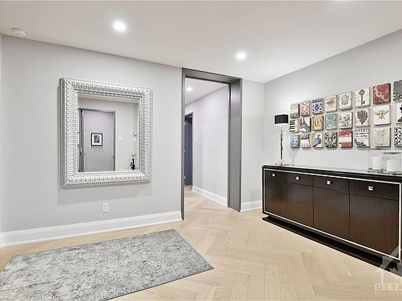 Impeccable design & a refined palette of finishes throughout this luxuriously renovated home with obvious attention to detail will captivate you upon entry. A grand foyer welcomes you & leads to an expansive living area highlighted by wide plank White Oak Herringbone flooring throughout. An open concept chef's kitchen with an over-sized Bianco Carrera clad island, Bosch 800 Series appliance package includes an integrated coffee station & induction cooktop overlooks the entire space. The marble surround island fireplace creates a focal point & leads to a serene media space. 2 large BDRMS features custom storage solutions to amaze & both baths feature heated marble flooring, glass shower enclosures, & an abundance of storage. Sweeping views of the city, Parliament, the Ottawa River, & Gatineau Hills provided by wall to wall windows add to the drama.