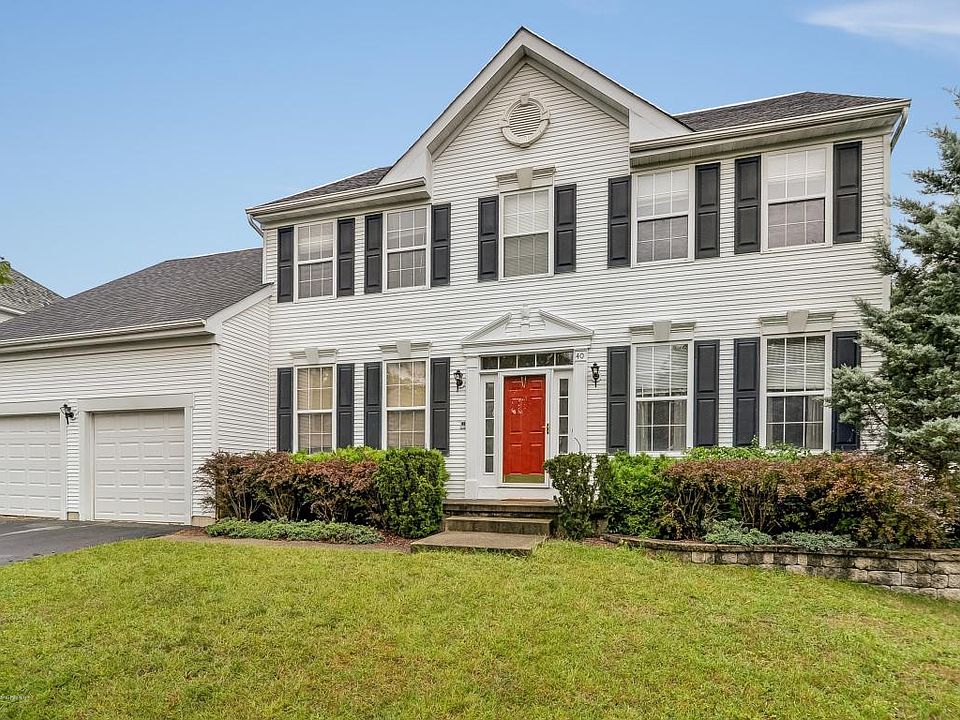Sought after Monmouth Ridings Colonial home with 4/5 Bedrooms (office/den on 1st floor), 2.5 Baths, 2 Car Garage w/a FULL BASEMENT. Set in a beautiful neighborhood! This lovely home is tucked away in a private location that looks out to trees! HARDWOOD floors in Living room,Dining room ,Den ,& Family room. Tiled foyer & kitchen. French doors to OFFICE/DEN w/custom built-in bookcase. Kitchen w/center island & breakfast area to sliders onto a deck w/a fenced in YARD. Sunken Family room w/vaulted ceiling, 2 skylights, & f/p. Very generous size bedrooms! Over 30recd lights! Very close to Manasquan Reservoir, parkway, several major roadways, shopping, schools, parks, library many restaurants & BEACHES !!