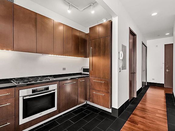 This unit has modern kitchen boasting black granite countertops, custom walnut cabinetry, custom paneled Sub Zero refrigerator and freezer, a Miele oven, and a custom-paneled dishwasher. The living room features floor-to-ceiling windows and Brazilian Walnut floors .
