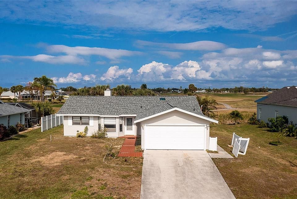 ROTONDA WEST PEBBLE BEACH – 3Bed/2Bath/2-Car Garage home overlooking the canal and 17th green of The Palms golf course. Recent repairs made to address damages from Hurricane Ian include: a new shingle roof, all new soffit and fascia, all new exterior paint, partial replacement of the exterior vinyl siding, and replacement of damaged drywall/insulation in some rooms. The interior is a blank slate, ripe for renovation and your personal touch! The home features a split bedroom floor-plan and includes a Cathedral ceiling with wood burning fireplace in the living area. The dining room offers natural light through the skylight, which enhances the open, airy feel. The kitchen provides a great opportunity for new owner’s selections and upgrades. Spacious Master suite includes a double closet, and en-suite bathroom. Interior laundry room includes washer/dryer. The Rotonda West deed-restricted community is just a short drive to Gulf beaches and is a golfer's paradise with 5 championship courses within the community and 10 more within a short drive.