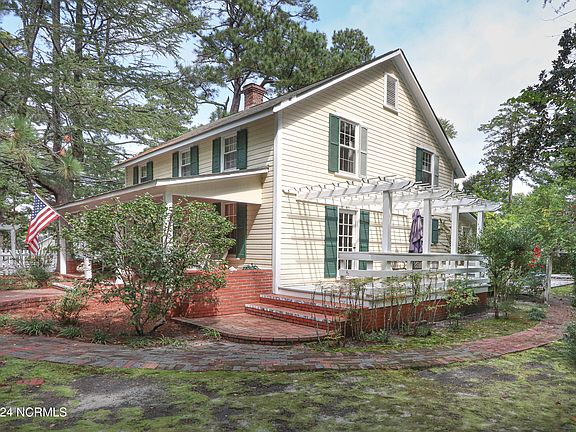 LOCATION! Charming, Old Town Cottage in the Historic Village of Pinehurst just steps from the pubs, restaurants and Village shops. You will love the brick curved walkways, white picket fence and welcoming wicker rockers on the front porch. Inside is all the character expected of a circa 1916 home. Heart of pine floors and floor to ceiling built-in shelving in the living room, dining room and kitchen. Kitchen is bright and sunny with white cabinetry. Handsome wood trim frames glass pane door in dining room leading to sunny side porch. Screened porch and brick patio overlook beautiful in-ground pool in private back yard.Primary bedroom on first floor with three additional bedrooms upstair. Home has been used for short term rentals continuously. Call Pinehurst Country Club for information about securing a PCC membership.There is not a membership for transfer.Home does not have a short term rental certificate.Home can be rented for 30 days or more.