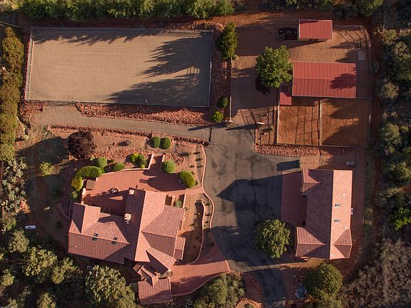 Back on market beautiful horse property with panoramic views of some of Sedona's most iconic red rocks. Beautiful, private, custom home on 3.09 acres with panoramic unobstructed Red Rock VIEWS of Bell, Courthouse, Castle Rocks and Lee Mountain. Backs to Forest Service on East side of property which is accessed by it's own private gate. An equestrian lovers dream with lighted riding arena (sand and rubber mix overlayment), stables and hay barn. 3102 sq. ft. 3 Bdrm, 2 1/2 bath main home with detached three car garage with 508 sq. ft. fully furnished guesthouse. Perimeter fencing in place. Gated subdivision.