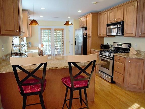 Beautifully maintained 3 bedroom, 2 bath condo, occupying the 2nd and 3rd floors of a multi family in East Arlington. Located just off Mass. Ave and steps to the movie theater, shops, restaurants, library, bus and bike path. The main floor in this sunny 1790 sq ft unit features an open concept dining, living and kitchen which opens up onto a private deck. Also on this level are a bedroom, full bath and home office with French doors. On the third floor is the spacious master with custom walk-thru closet and private deck, bedroom 3 and a full bath. There is dedicated driveway parking for 2 cars and a shared yard. The unit has hardwood floors throughout, plenty of closet space, stainless steel and granite in the kitchen, gas heat, central AC and a private basement storage area with laundry facilities. Available Dec 1st.