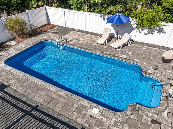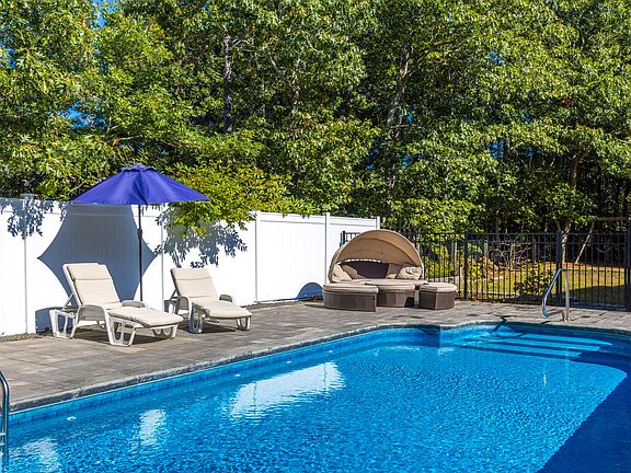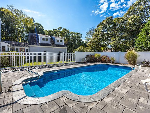 Contemporary style home located on a quiet wooded side street on the bayside of Eastham. The home offers an open floor plan with cathedral living and dining area, wood floors and screened porch. A well-designed kitchen with upgraded cabinets, tiled floors and a slider leading to a deck area overlooking the built-in pool. A primary bedroom with private bath, 2 spacious 2nd level bedrooms and bath, home office and den. A built-in pool, large, oversized garage and detached shed, irrigation, standby generator and smart lighting.