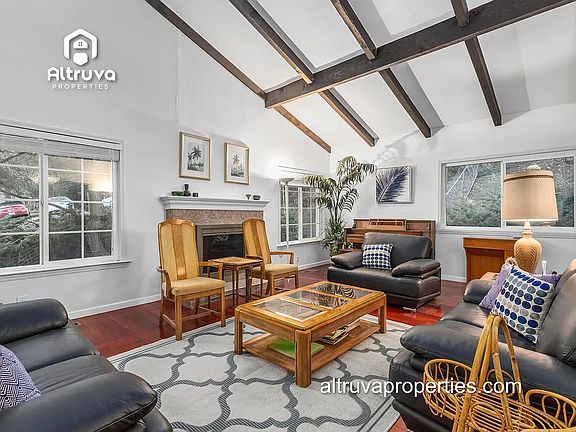 Completely remodeled in 2008, the home features rich redwood floors, striking exposed beams, and large picture windows that frame views of nature. The main living area offers an open, airy feel with soaring ceilings and a fireplace that anchors the space for cozy evenings in.