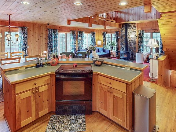 - Description: Lovely great room w/ woodstove and a 2-story wall of south facing windows.
