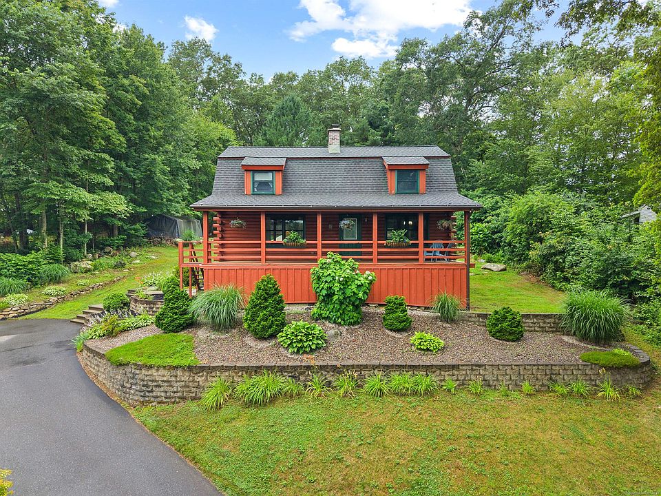 Welcome to this beautifully crafted log home, nestled on a picturesque, terraced lot surrounded by mature trees and lush gardens. From the moment you arrive, the charm is undeniable-curved stone paths, tiered landscaping, and a wraparound front porch set the tone for relaxed country living. Step inside to warm wood finishes, exposed beams, and a cozy living room anchored by a brick fireplace with a wood stove insert. The open-concept kitchen and dining area are framed by large windows that bring the outdoors in, creating the perfect setting for everyday living or entertaining. Upstairs, you'll find three inviting bedrooms, including a spacious primary suite with dual walk-in closets. A finished lower level extends the living space with a versatile room ideal for recreation, hobbies, or guests, along with a dedicated laundry area and utility room. The expansive backyard features a private patio, a storybook gazebo, and plenty of space to enjoy the peace and beauty of nature. This home offers the ideal balance of rustic charm and modern comfort-all within a thoughtfully landscaped and gently sloping lot.