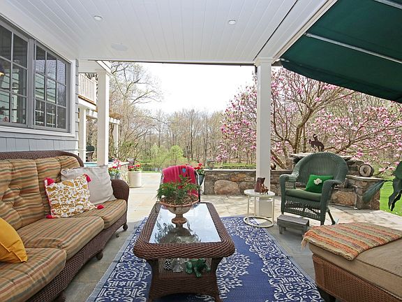 Most enchanting private retreat on 5.1 stunning acres featuring picturesque pond and dock (with electricity/lights) bordered by Redding Land Trust for idyllic tranquility. Custom built in 2000/2001 by the builder and his wife, a notable fashion designer, incorporating a small portion of the original 1938 cottage with state of the art new construction. This truly one of a kind shingle style home will enthrall with its understated elegance, open flow, and playful sensibility throughout the indoor and outdoor living spaces including the multiple porches, cheery awning and pergola, built-in spa, and stone terraces leading to the sweeping lawn and pond vistas. Total 4,326 square feet including the main home with 3,596 square feet, 3 bedroom, 3/1 bath plus the detached barn featuring lower 3 car garage/workshop plus 730 square feet above for ideal studio/home office. Exquisite form and function: energy efficient, extremely tight construction; 165 btu Weil McLean boiler and air handlers new in 2001 plus 2 zones radiant heat (family room and Master Bath); Lutron lighting; Marvin and Lincoln exterior doors/windows; whole house generator; 50 year roof; copper leaders and gutters; and all Grohe or Broadway brass faucets. Incredible attention to detail throughout with custom mill-work/built-ins; 3 fireplaces including great room, breakfast room, and living room; all ensuite bedrooms with patio or balcony; master bedroom suite with sauna plus custom tile soak tub and open shower; 260 bottle climate controlled wine storage; and outdoor shower complete this dream home. Top West Redding location, approximately 1 hour to NYC.