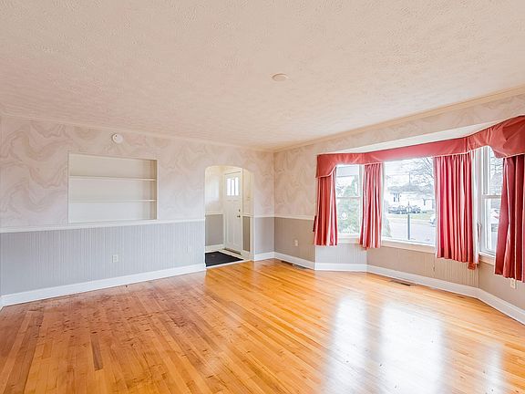 As you step inside, you're greeted by a spacious living room adorned with hardwood floors and a bay window.