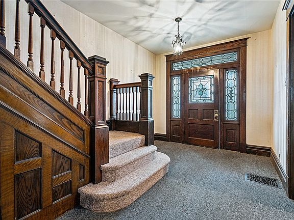 Lovely 112 year old home in North Hills School District, Ross Township, but within walking distance to Bellevue shops & Restaurants. Enclosed front multi season porch is 22 x 6'8". Step inside the home to the 13x9 entry with gorgeous wood staircase, trim work and pocket doors. Baseboards are 9" high. 1st floor ceilings are almost 9' / 2nd floor 8' 6". Formal living room with stunning leaded glass window, dining room with built in china cabinet and kitchen w/pantry & door to the covered back porch. The 2nd floor has 4 bedrooms (1 has a kitchen in it) - home had been shared by two families at one time. The 3rd floor has a 13x10 room & a 15x8 & 9x8 divided room (had been used as additional 2 bedrooms in the past). Sprawling lower level unfinished basement has: Pgh commode, 12x10 laundry area, 6x7 workshop, 13x8 area with built in seating & 16x10 room - glass block windows. 1 car detached garage. Additional off street parking spot in rear or could remove back fence to add more parking.