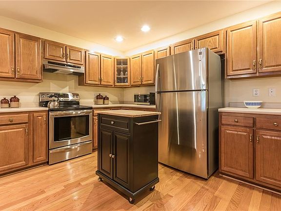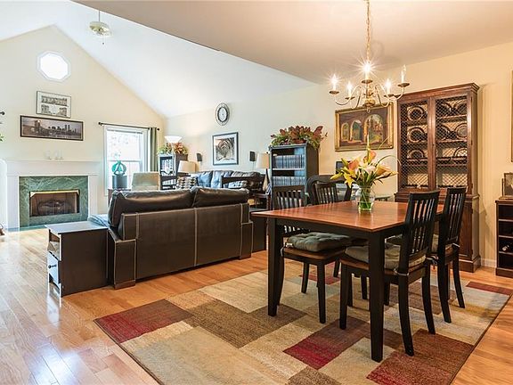 Delightful ranch style home perfect for easy single level living. The open floor plan flows effortlessly from kitchen to formal dining room to living room with vaulted ceiling, cozy fireplace & wood floors, providing plenty of space for entertaining friends and family. A large kitchen boasts newer appliances & natural cabinets. The master suite offers a walk-in closet,vaulted ceiling and full bathroom. Second bedroom and full bath complete the above grade living area. The finished lower level provides a large bonus room, den/office & plenty of storage space. The one car attached garage enters directly into the home. Conveniently located across from the 55+ association's club house providing easy access to activities and entertaining space.