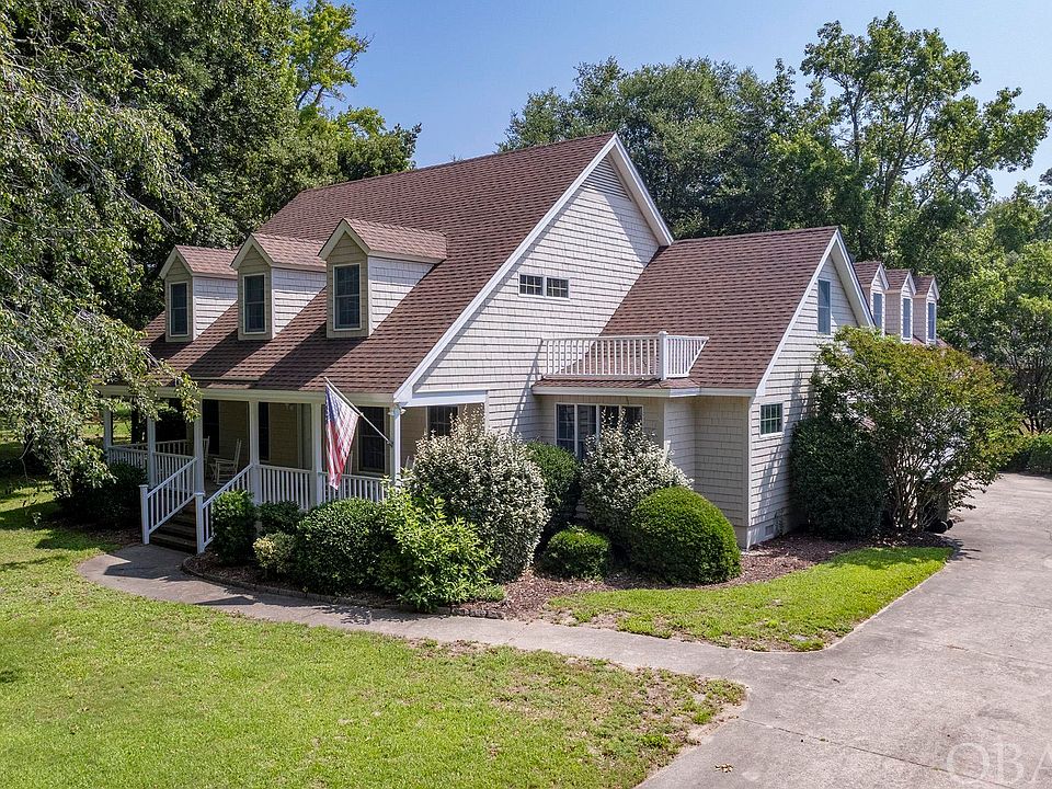 You'll be greeted by curb appeal and charm as soon as you pull up to this Cape Cod style custom home on a large canalfront lot in Southern Shores. The front yard is nicely landscaped with golf course views. The entire backyard is canalfront with ample yard space, beautiful mature trees and includes a canalfront dock. The canal leads to the open waters of the Currituck Sound. Enjoy boating and kayaking right from your backyard. The home was custom built in 1993 and has remained in the same family ever since and never used as a rental. While the home is advertised as a 3 bedroom, it is functioning as a 4 bedroom and with more additional bonus space. The covered front porch adds to the charm, welcoming you as you walk thru the front door into the hardwood floor entryway with views of the stone fireplace in the living space. The formal dining room is to your left before you get to the living space. As you enter the family room, you're greeted with tall ceilings and open space. You'll see the kitchen to your left. Two walls of windows surround the kitchen table, with plenty of space for a large dining or farmhouse table. The kitchen space itself is workable, with plenty of cabinets, natural light and best of all, a very very large pantry! This is a kitchen designed for someone who loves to cook and entertain! Off of the kitchen and family room, accessibly by ample french doors, is a large covered screen porch that also backs up to the fireplace. The screened porch leads to the large backyard. On one side of the living space is the primary bedroom with walk-in closet and large attached bathroom. Down the hall, there is a powder room, a laundry room with wash sink and storage and the entrance to the HUGE garage. The owners walled off one section of the garage to be storage, and it's accessible from the backyard via an exterior door. On the second level of the home you'll find one full and one half bathroom, 3 additional bedrooms and lots of bonus space. One of the bedrooms has a walk-in closet that leads to a large unfinished space that could easily be finished into a playroom, office or bonus space! It's huge! Another bedroom has an attached finished office/craft space. Additionally, there's a door leading from the hallway into walk-in attic storage. There is so much space in this home! This gem is solidly built and ready for new owners to freshen it up with some cosmetic updates. This home has so much to offer it's new owner!
