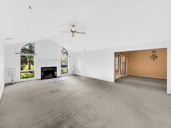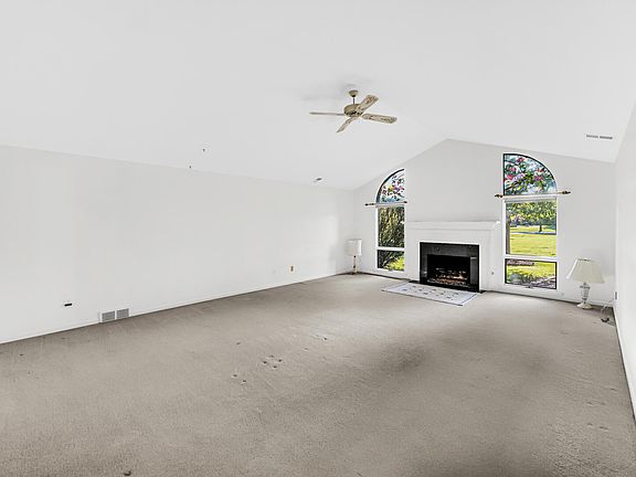 - Description: Vaulted ceiling, stained glass inserts in arch windows; fire place, ceiling fan, freshly painted