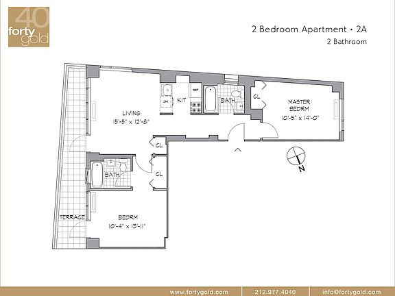 Welcome home to the largest corner split 2 bedroom, 2 bath layout with a private TERRACE at 40 Gold Street Apartments! This sun-flooded apartment boasts split wings for privacy and plenty of space for a Queen size bed and desk in both bedrooms. 2 full baths. abundant closet space, and a kitchen island. All within one of the most sought after, boutique, elevator, Full-Time Doorman buildings in FiDi/Seaport. This elevator building offers a complimentary gym, two rooftops, a Resident Lounge and a package room. There is also an App-operated Laundry Room on the amenity level with a view of the Brooklyn Bridge!