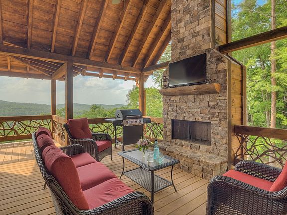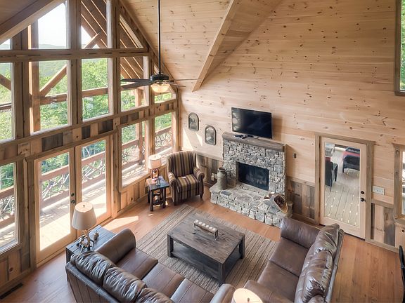Stunning Like New Cabin in Aska Adventure Area... close to historic downtown, USFS trails & Toccoa River...craftsman quality with rustic flair & distinct detail...4 bedroom/3 bath style cabin is perched on large wooded tract with towering hardwoods & lush, gentle landscape, lavish living area boasts sky high ceilings & "wall of glass," massive stone fireplace in great room, unique & warm industrial finishes, plentiful windows, custom cabinetry w/granite counters, tile showers & baths, upscale fixtures & extras throughout...finished terrace level w/wet bar, den/rec room with fireplace & guest qtrs + cozy bunk room, oversize "party porch" features fireplace & relaxing views, multi levels of porches & decks are great for outdoor entertaining, easy access with plenty of parking in rustic gated community w/ultimate privacy, conveniently yet tucked away, fabulous fire pit and established rental history! Tasteful furnishings available separately for a turn key deal...A Step Above!
