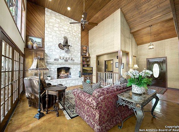 This 36 acre property has the advantage of being located just minutes from downtown Boerne and Interstate 10. An automatic private gate leads you down a meandering tree-lined circular drive. The exceptional grounds truly make this property unique and boasts a seasonal creek, two stock tanks, horse-friendly pastures, a corral, mature trees and natural vegetation. The two-story ranch style home features comfortable finishes which include accented brick walls and flooring, interior native stone fireplaces, beadboard ceiling treatments and exposed beams. The floor plan encompasses a great room with a bar, French country chic kitchen, private study, loft and spacious secondary bedrooms. The split downstairs master suite is complete with a wood burning fireplace, outside access and dual walk-in closets. The renovated master bath features dual vanities, make-up vanity, garden tub and walk-in shower. The ranch provides a wide array of opportunities for the new owners, it is ag exempt and hunting is permitted! Perfect for every day living or as a weekend ranch or hunting retreat!
