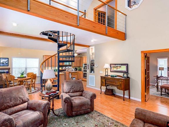 Very open floorpan with vaulted ceiling to overhead walkway. Guest quarters upstairs for privacy. Great neighborhood on the White River in Cotter, Arkansas, just around the corner from the famous 'Rainbow Bridge'. Possible long term lease.
