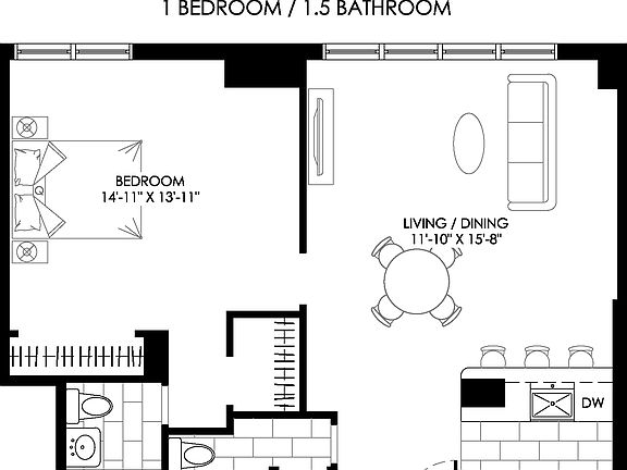 Spacious one-bedroom apartmentAdditional half bathroomIn-unit washer and dryerKing-sized bedroomGenerous closet spaceModern and functional designHardwood floors