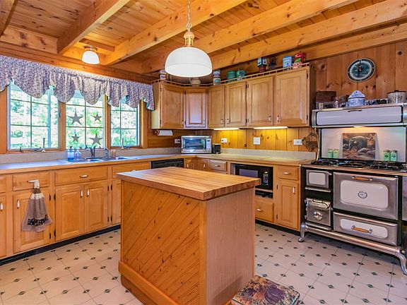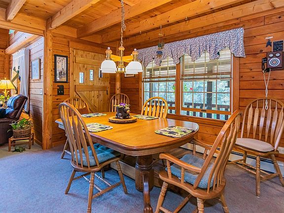 This immaculately maintained log home is the site of the former Haskells hotel. The wrap porch overlooks beautiful grounds on a quiet side road. The property boasts high ceilings with exposed beams, knotty pine, a country kitchen with a 6 burner "vintage" range, central vacuum system, whole house generator, wood shop with walk out basement and a paved driveway. The heating system has been recently updated. The 2 two car garages, one with a huge attic for storage, provide plenty of space for storing all of your toys! There is a wood stove in the basement. The loft has 2 full bedrooms as well as an open space that could be used as an office or more sleeping space. Easy access to hundreds of miles of groomed snowmobile trails. With low taxes, this gorgeous home is a MUST SEE!