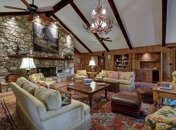 Located just a short walk to many of the amenities of Wildcat Cliffs Country Club. What a great mountain feel in the wonderful home from the moment you arrive. The exterior is wood and stone with a high gable front porch that invites you inside. The extra large greatroom has a high vaulted and beamed ceiling with a massive stone fireplace. Plenty of room here to entertain a crowd. The greatroom opens to a covered and open deck with golf course views of Wildcat Cliffs Country Club. The large kitchen also has a vaulted ceiling with a lovely eat-in area looking out to the beautiful landscaped yard. Three suites on the main level, two of which open to the deck. There is a man cave in the lower level which is accessed from the deck plus an additional guest area. A cart path to the course, and dinner at the clubhouse is an easy ride by golf cart!