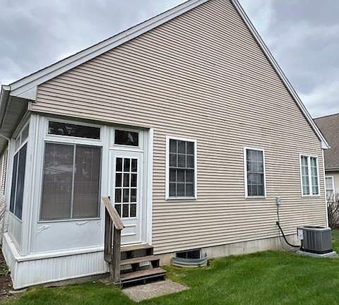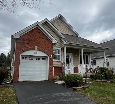 Discover comfort and convenience in this well-maintained 1,563 sq ft home nestled in the desirable Evergreen senior neighborhood. This charming 2-bedroom, 2-bathroom residence offers the perfect balance of classic design and modern upgrades with a covered front porch perfect for enjoying morning coffee, elegant chair rail molding that graces the living room, dining room, and hallway, and a kitchen featuring timeless oak cabinets, designer backsplash, and durable Corian countertops. The dining room showcases an upgraded chandelier, while the master bedroom boasts plush new carpeting, and multiple ceiling fans throughout ensure comfort in every season. Enjoy additional living space in both the finished basement and the bright sunroom. The finished basement provides extra square footage and is a rare find in this community! Plus, practical features include a convenient one-car garage, newer roof (only 5 years old), and recently replaced hot water heater (2 years old) – offering peace of mind with reduced maintenance concerns in this premier senior community.