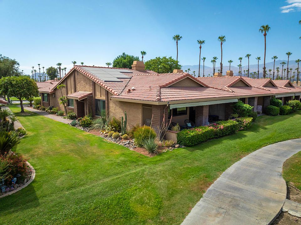 Welcome to this completely renovated 2051 sq ft 'El Grande' model which sits on the 11th hole of the golf course facing west, with mountain and pond views from the spacious tiled patio. This 3 bedroom, 3 bath home is TURNKEY and luxurious, with high ceilings, real wood floors, and an open chef's kitchen with large picturesque window. Great room with fireplace and bar, as well as a separate dining area. Each bedroom has its own remodeled FULL bath! Separate laundry area. Garage has dual EV chargers! This home has newer OWNED solar and has beautiful desert landscape leading up to the entrance. Perfect home to just bring your toothbrush!