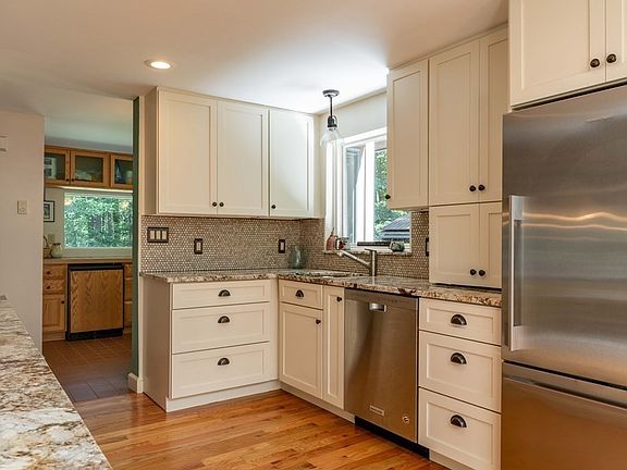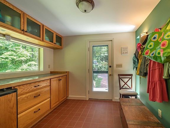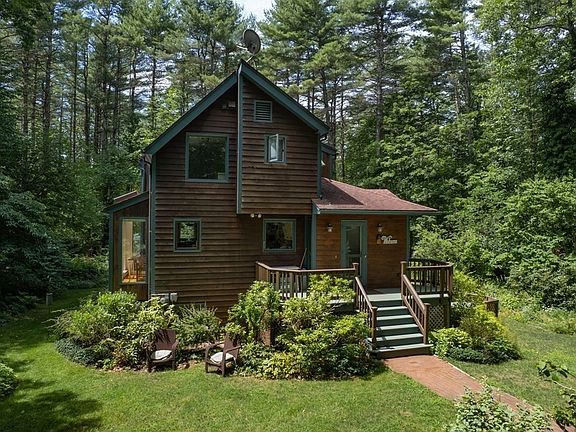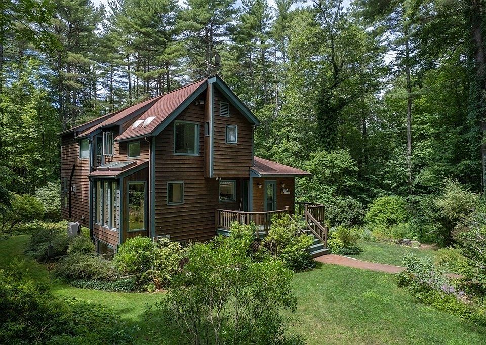 Please submit OFFERS by 12PM Tuesday, August 2. This lovely 3 level home is truly an oasis, tucked in the woods with total privacy yet just 12 minutes to The Mill District, UMass & Amherst center. The enviable chef's kitchen is both casual and elegant, with a gorgeous island for work space & entertaining as well as a light filled breakfast nook. An open floor plan allows for the cast-iron propane stove to heat the entire first floor and with the beamed ceiling adds a cozy element to the living & dining areas. Generous primary suite upstairs features built-in shelving, two closets, and a bathroom with soaking tub & separate tiled shower. Hall bath with tiled shower, and a second bedroom with a built in twin bed & desk complete the second floor. The walk-out lower level has yet another full bath w laundry, bedroom/office & a sitting area. There is a whole house generator, & mini-splits for heating and cooling (2021) optimize the owned solar array. Beautiful windows throughout!