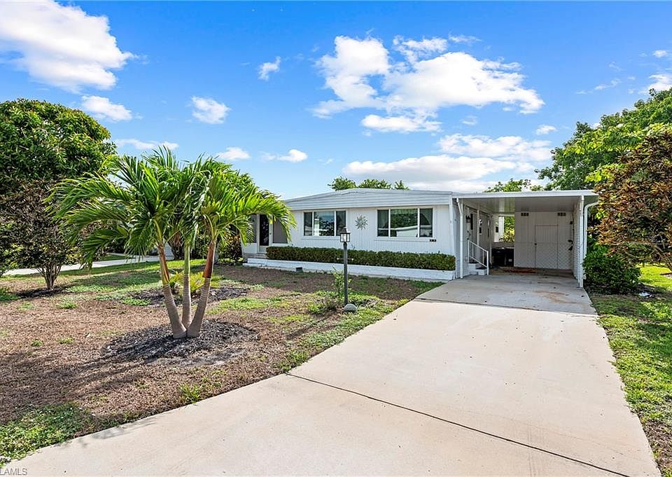 Amazing deal in Riviera Golf Estates & you own the land! This well maintained 2-bed/2-bath manufactured home features stainless steel appliances, a huge Florida Room, Newer washer & dryer (2024), HURRICANE windows in the living room (2022), Plantation Shutters throughout the home, NEWER AC (2022), Newer Water Heater (2021), and a Newer Irrigation Pump (2023)...yes it has a well for irrigation keeping water costs down! Mature fruit trees will make you feel right at home for cooking or cocktails with avocado, banana, lemon & lime trees on the sides of the home! The pet-friendly community features a ton of amenities for its very low HOA fee of only $431/quarter...pickleball, tennis, basketball, gym, shuffleboard, and recently renovated community pool which is heated and salt-chlorinated...also, Wi-Fi is included in the fees. Location is fantastic as it is close to the shopping, dining, and entertainment district of Olde Naples, Naples Beaches, I-75 and so much more. Don't let this deal get away!***(Cash Only)***
