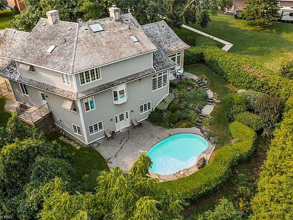 Perched on the top of the Escarpment on a private culdesac above Mountain St. you will find this magnificent quality custom built, timeless design, meticulously cared for one of a kind home that specifically took advantage of the incredible views of the Toronto skyline on clear days & fantastic sunsets. The 2 main levels have over 2600 sq ft plus another 1600 sq ft, yours to complete in the bright basement level with 9' ceilings & walkout to the peaceful pool area & patio that offers nature & privacy. Driving up the interlocking driveway you will capture the workmanship of the detailed architecture, brick work & beautiful cedar shake roof before you enter through the arched front porch into a stunning foyer with soaring ceilings & winding staircase. Walk into the massive grand living rm/parlour that can be a cozy sitting area with the gas FP & endless built-in custom cabinetry or entertain a household of guests, it's that big. Sorry, but the grand piano leaves with the seller! The natural light filled rm has 10' coffered ceilings, 9 layer crown moulding, windows with views from all sides & sliding doors to a quaint patio. The formal dining rm is an extension of the living rm with more stunning views which leads to the large thoughtfully designed kitchen with an island as the center piece. Down the hall on its own separate wing is a comfortable main floor bedrm currently used as an office/den. The 33' double door garage fits 2 cars plus your hobby car, workshop & still room to spare. The upper level at the top of the staircase case off to the left is the ever expanding master bedrm where you will truly benefit with the breathtaking views, city lights & on certain days clearly see the CN Tower & Sky Dome over Lake Ontario. Continue through to the master bath & huge walk-in closet. The 2nd upper bedrm has an ensuite privilege bath. Enjoy the convenience of the 2nd floor laundry rm. Outdoors the mature trees & landscaping frame this special home over looking the city.