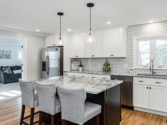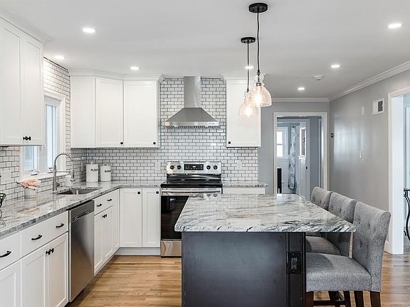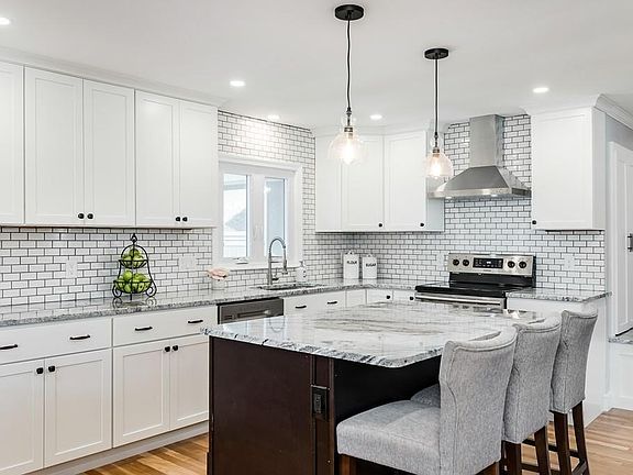 OFFERS Due Monday @ 7pm Welcome Home to this stunningly renovated expanded ranch in desired quiet neighborhood, walk to schools, shopping & restaurants. Stylish NEW kitchen, granite counter-tops, stainless-steel appliances, vented range hood, island breakfast bar & pantry. Light & bright Living/Dining room with crown molding, gleaming newly refinished hardwood floors, oversize family room, full bath & 4 spacious bedrooms including enormous master suite w/ master bath complete this floor. Both baths have been tastefully updated w/ custom tile work. Downstairs hosts finished bonus room, w/ wood burning brick fireplace. Great potential in the large laundry room w/ sink, storage & garage access, same w/ separate mudroom area w/ own entry & still more space for storage/workshop. Freshly painted, new windows & carpet, new architectural shingled roof & vinyl siding, new water heater, storage shed, recessed lighting, energy efficient Nest thermostats, updated 200 amp electrical...List goes on.