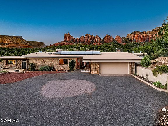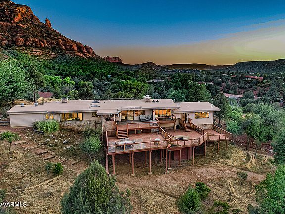 A SEDONA CLASSIC perched on a hill & capturing unobstructed red rock views & amazing sunsets. Mid-century modern front exterior boasts architectural clay brick. Lounge in the living room in front of the fireplace & take in the views across the vast deck which encompasses the back of the home. Updated kitchen with subtle-vein white engineered quartz, contemporary cabinets, gas cooktop & Arizona room where you can grow your fresh herbs for gourmet cooking. A few steps down to the primary bedroom with ensuite, envision awaking to red rocks. Second bedroom has the same stunning NW views. A third private guest bedroom is downstairs with its own bath, lounge area, kitchenette & exit to exterior deck for privacy. First floor off great room is den with east views, solid wood walls & ceiling The landscaped grounds on 1.58 acres backs to a dry creek & have been painstakingly planted & cared for by current owner over the last seven years. The number of amazing plantings will enthuse an astute nature lover. Entertaining is a joy! The boundless deck has been shored up with recent maintenance & new aircraft cable wiring. On one level is an inset fire pit to enjoy gatherings and star gazing & another level has the BBQ area.
