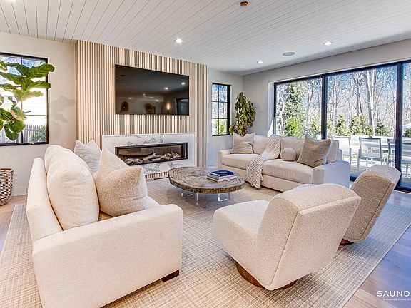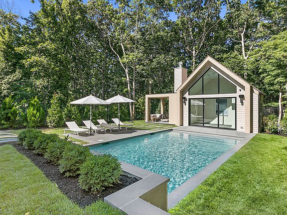 Get ready to enjoy an unforgettable Hamptons Summer experience in this newly constructed Sag Harbor contemporary, just a moments' walk to the powdery sands of (private) Ninevah Beach, complete with mooring rights. This remarkable rental is furnished with chic decorations by the renowned decorator Elsa Soyars'. This 5-bedroom has everything you'll need and features the finest finishes and amenities, from custom fireplaces to the detached pool house with a full wall of glass overlooking the heated pool. The open floor plan features a stunning double-height foyer and glass staircase and features an open kitchen anchored by a welcoming island overlooking the lush backyard and pool. Entertain in the living and dining room wet bar and enjoy indoor-outdoor flow through sliding glass walls providing direct access to dining on the back patio. A guest suite (or office) on the first level is accompanied by 3 en-suite bedrooms on the upper level, including a gorgeous primary bedroom with a private terrace overlooking the backyard, and one additional ensuite bedroom on the fully finished lower level. There is also a large flex room, perfect for a playroom, and a gym space with a sauna. Outside, your private sanctuary awaits with the serenity of falling water into the heated pool and pool house which features a covered lounge area replete with a fireplace to curl up to on cool summer nights, after days at the beach or after dinner in one of Sag Harbor Villages many restaurants, all just a mile away!