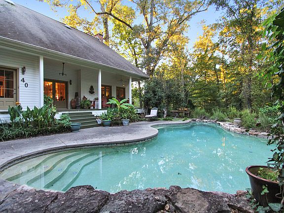 Own your piece of paradise today! Sitting on 2 acres, 40 Little Bayou Rd is perched on a hill overlooking a beautiful tree-shaded property. Enter through the large welcoming front porch to find an exceptional home with an open and bright floor plan. Living area includes large windows, soaring ceilings, and a grand brick fireplace. Beautifully appointed gourmet kitchen with oversized island leads to the dining area that overlooks the pool and private backyard setting. Master is located on the 1st floor & includes a wonderful ensuite with clawfoot tub and separate shower. Laundry & theater room finish off the 1st level. The 2nd floor includes a flex landing area that leads to 3 additional bedrooms and two baths. Follow the stairs to the third level and you will find a large bonus room with additional storage. Home features a triple car garage with room for additional parking and pool house with full bath. Southern Acadian style design sitting in a gorgeous wilderness setting!