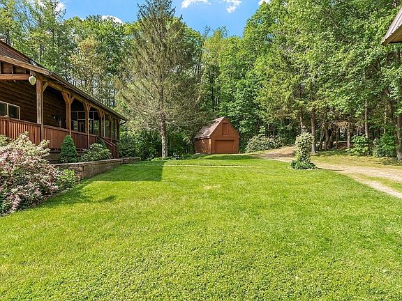 Nestled on 4.6 serene acres, this charming four-bedroom, two-and-a-half bath log home offers the perfect blend of rustic comfort & modern convenience. A spacious deck wraps around the home, with a portion screened in. Lush, vibrant flowers surround the home. Inside, the cabin features warm wood finishes, an open-concept living/dining area, pellet stove, wide White Oak flooring, Quarry Tile in Kitchen, 1/2 bath. 2nd floor features 3 bedrooms with Spruce flooring, balcony, full bath. Walkout basement has family room with pellet stove, a full bath & 1 bedroom or office. Newer Buderus furnace & newer hot water heater. Above the detached 26' x 32' garage with 9 foot doors & metal roof, is a private potential in-law apartment. Features kitchen, bath, 2 additional rooms & provides flexible living space for guests, extended family, art studio, etc.. Utilities are not separated.