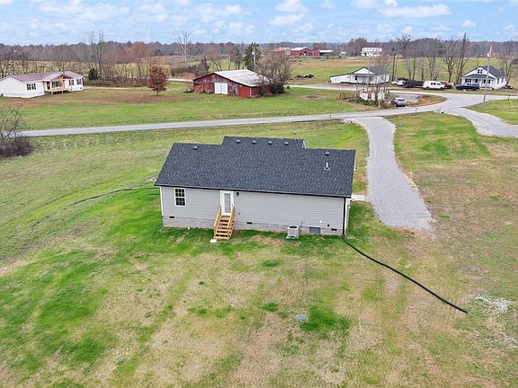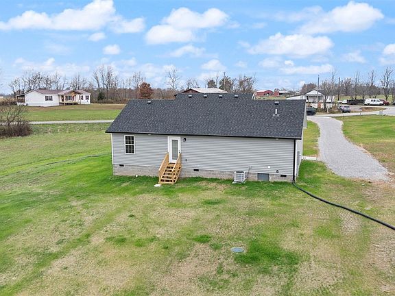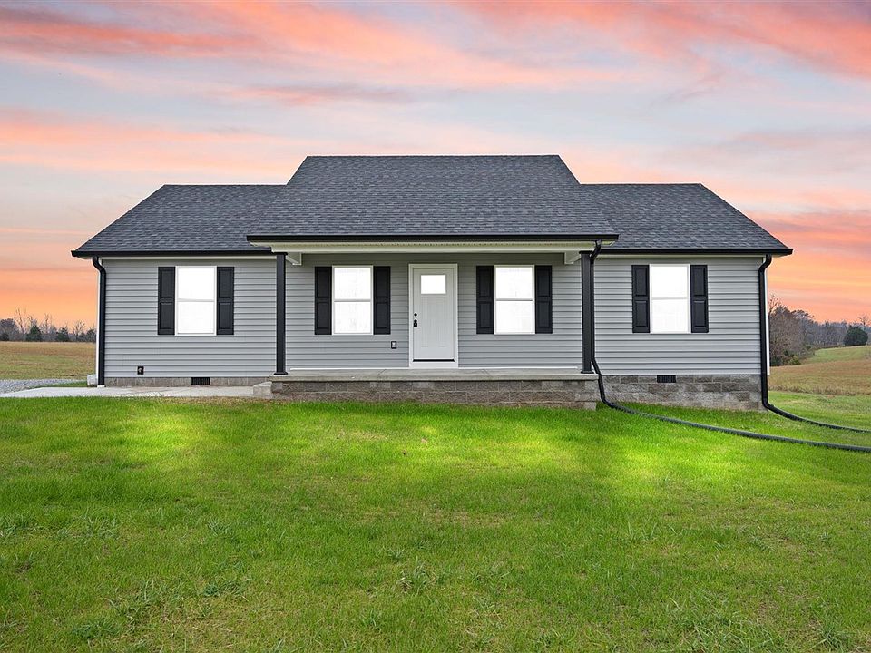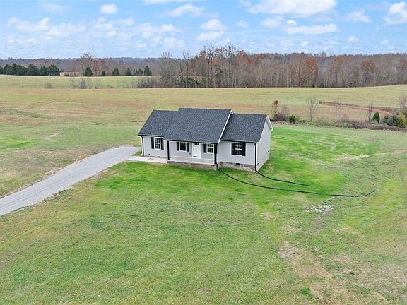 Beautifully built and fully move-in ready, this 3 bed, 2 bath ranch-style new construction home sits on a full acre in a quiet rural setting. The open living and kitchen area features vaulted ceilings, recessed lighting, and attractive vinyl plank flooring, with carpet in the bedrooms for added comfort. The kitchen offers a modern farmhouse appeal with white soft-close cabinets, black hardware, granite countertops, and a large island with sink centered for convenience. All stainless steel appliances remain with the home, and the laundry room i tucked just off the kitchen for easy access. The primary bedroom includes its own private bath and walk-in closet, while the two additional bedrooms are located on the opposite side of the home and share a full bathroom. Located only 12 minutes from Nolin Lake, 5 minutes from the Dollar Store, 30 minutes from Elizabethtown, and 20 minutes to Walmart in Leitchfield, this property blends comfort, style, and convenience. Start making memories in the beautiful new home today! Professional Pictures coming soon.