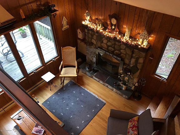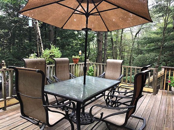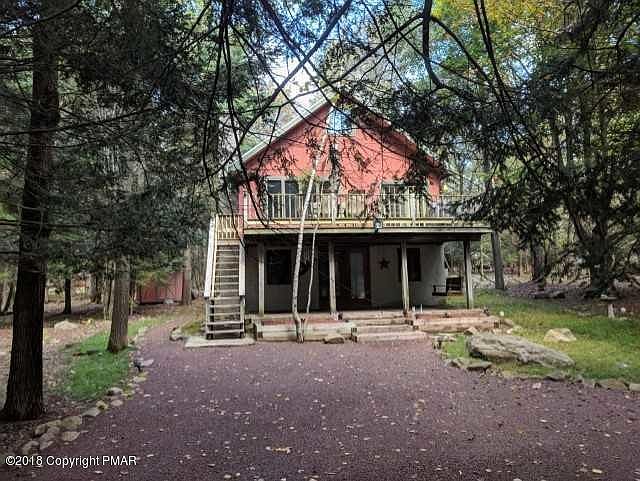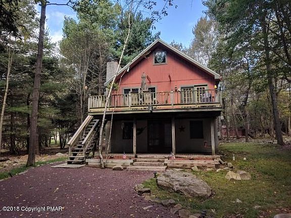 4 BR / 2 Bath A-Frame Chalet offers 3 floors of entertainment for you or your guests! Top Floor is Loft that adds the additional sleeping for guests. Lower Level bar area is original plank board from a South Carolina barn featured in its picture displayed in the room! Almost all furnishings remain for turn key enjoyment! See list of items remaining! Lower Lush green tree's surround you as you enjoy Pocono Beauty in one of its busiest rental communities! Bring your Golf Cart! Now allowed! Picture 2 is front of home!
