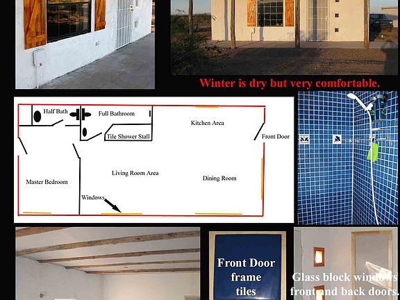$99000 NEW Adobe on 5 acres. REDUCED $21k Adobe House. NEW 2008 12 inch thick walls! 5 Acres. This is a sustainable house project and is a real Adobe, Plaster and Stucco home being finished this year. Well insulated and quiet inside. Roof is a plantation style made of lifetime metal. The walls are 12” inches thick with real 10 to 12 inch diameter Log beam ceilings 9 foot tall in all rooms (10 of them span the width of the house). There is 1100 sq ft total living area. There is also a 22’ X 22’ garage shop beside the house. The home is 90% complete and I hope to finish in the next 6 weeks OR you can finish it with your own colors etc. I am now ready to install the kitchen cabinets, outside front door frames with tile inlaid, appliances and tile floors. The bedroom is in the rear of the house with a half bath attached. One full bath with Cobalt blue tile shower stall. This room is now ready for floor tile. Property has new septic and the best water supply I ever tasted (well 125’ deep). Lots of land, comes with 5 acres. The property is located 12 miles south of a town called Deming NM. Altitude is 4600ft. Things are very green in spring and goes to dry in the winter. It’s very pleasant temperature for year round living with very low humidity. You will be 25 miles from the boarder of Mexico. No problems here since the boarder patrol is stationed right here in Deming. People around you are about 50 to 100 acres away. It’s so quiet here you can here your heart beat. No pollution, no cars no noise (except the birds of which there are many) and no aircraft noise just the occasional farmer and his machinery going by. If this sounds good feel free to call me at 575-544-0228. Sale price WAS $120,000 After this ad expires it goes back to $120k at which time the finishing touches will be added. See photos at www.hydroponicdoctor.com/adobe1.jpg