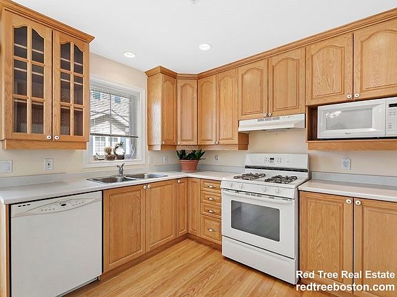Sunny & spacious well maintained 2 bedroom / 1.5 bathroom end unit Townhouse featuring two levels of living area. First floors consists of hardwood floors through-out, modern kitchen equipped with a gas stove, dishwasher and plenty of cabinet space, separate dining area w/ balcony off of kitchen, gas fireplaced living room, first floor laundry and half bathroom. Second floor consists of 2 large bedrooms with plenty of closet space and a full bathroom. Additional features include central a/c, 2 car side by side garage parking along with plenty of storage. Walk to popular Moody Street with plenty of restaurants and shops. Easy access to the commuter rail and all major routes!!